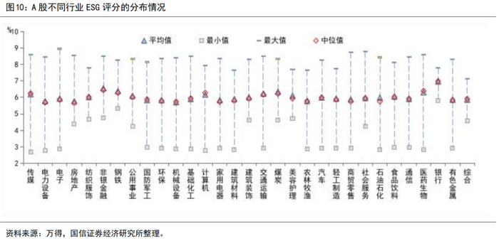 A股不同行业ESG评分的平均水平和分布范围大体相近。各行业ESG评分平均值的范围为5.71至6.96,其中最高的五个行业依次为银行、非银金融、钢铁、煤炭、医药生物,ESG评分平均值最低的五个行业依次为机械设备、电力设备、房地产、农林牧渔、环保。各行业ESG评分分布情况方面,分布较为集中的行业包括电子、传媒、商贸零售、医药生物、电力设备,分布较为分散的行业包括银行、综合、钢铁、美容护理、纺织服饰。