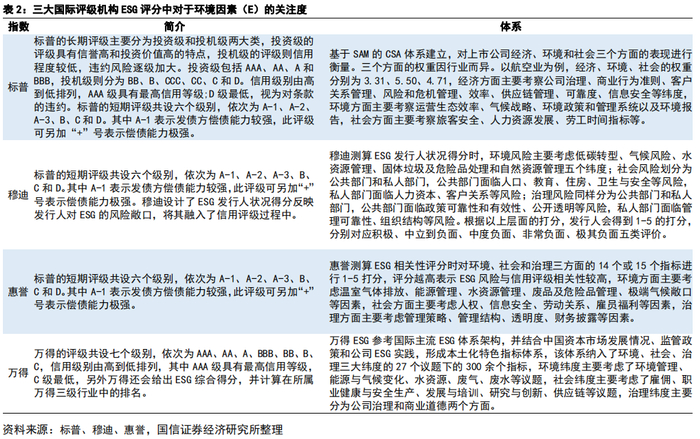 下表2汇总了标普、穆迪、惠誉以及万得的ESG评级体系,国际三大评级机构对ESG进行打分时,E(Environmental)只是其中一方面的侧重,在公司治理(G)和S(社会)上也具有较高比重的考虑,从评分的设置上也可以发现,环境只作为评级、评分因素的考察因素之一。