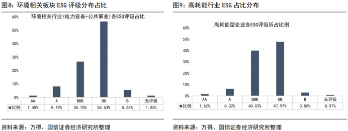如果我们将行业区分为环境相关行业(主要为环保和电力设备)、高耗能行业(按照《2010年国民经济和社会发展统计报告》对六大高耗能行业的定义,包含化学原料及化学制品制造业、黑色金属冶炼及压延加工业、有色金属冶炼及压延加工业、非金属矿物制品业、石油加工炼焦及核燃料加工业、电力热力的生产和供应业)。从评级来看,高耗能行业和环境相关行业没有明显区别,甚至高耗能行业BBB和BB评级的分布相对均匀,并不是说对环境友好型的行业评级就会天然更高,虽然现在国内产业在朝向绿色化发展,但环境(E)相关度只是ESG考察的一方面。