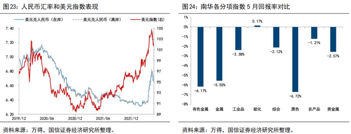 我们编制了基于金融市场的狭义流动性口径国信货币条件指数,以及基于实体派生的广义流动性口径国信货币条件指数。狭义、广义两类指数对Shibor 3M利率、信用脉冲平均有3个月和6个月左右的领先性。目前狭义口径指向“货币”将维持在宽松的环境内,广义口径的货币指标指向信用环境即将企稳回升,考虑“信用-利润”的传导,需求侧的BCI指数指向5月较4月底出现了回升:随着国常会部署稳经济一揽子措施,全国稳住经济大盘电视电话会议的顺利召开,企业信心得到修复,指向从信用到利润的传导正在逐步理顺、走向通畅。因此,“风火轮”2.0指向三季度强化第一象限“双宽”的定位,股票和商品的胜率会得到提升。而根据美联储的态度,在“防通胀”和“防衰退”的苦涩选择之间,政策甚至选择前者,对于商品市场而言仍存在一定的风险。