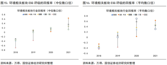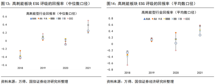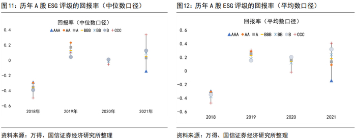 回看历年不同ESG评级的A股公司中位数和平均值口径下的回报率分布情况,可以发现,在早前呈现出评级越高的A股公司回报越高的规律,在2021年展现出不同趋势。具体来看,中位数口径下,2018年整体表现符合评级越高回报越高的规律;2019年整体表现符合规律,但是AAA级公司回报表现不佳;2020年整体表现符合规律,但B级公司回报率表现较为突出;2021年整体表现呈现出评级越低的A股公司回报越高。平均数口径下,同样表现出2018年至2020年整体符合评级越高回报越高,个别等级的公司有超出规律的回报,但在2021年出现逆序排序。高耗能板块,2018年、2020年较符合评级与回报率正相关性,在2019年、2021年评级与回报率之间的关系并不明显。环境相关板块,2018年至2020年评级与回报率之间的关系并不显著,但在2021年呈现出评级与回报率的正相关性。综上,从投资回报和ESG角度的关系而言,并非适合作为回报来源的直接依据。