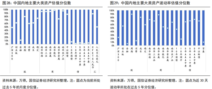中国和全球市场股、债、汇、商价格、波动率所处在过去五年的分位点显示:(1)从价格角度考虑(债券收益率视为价格反向指标),国内市场的股/债/商估值有所回升,股票中各风格板块中,周期、成长、稳定股估值水平较上月上行,除金融股外其余风格板块均位于过去五年间60%以上分位值,金融股估值水平跌至五年间12%分位值。债券方面,各品种价格估值均出现不同程度的上行,除能化外各商品品种估值较前值小幅下行,除贵金属外各商品估值水平位于过去五年间95%以上分位值。股票和商品波动性普遍与前期持平或有所下行,债券波动性上行。