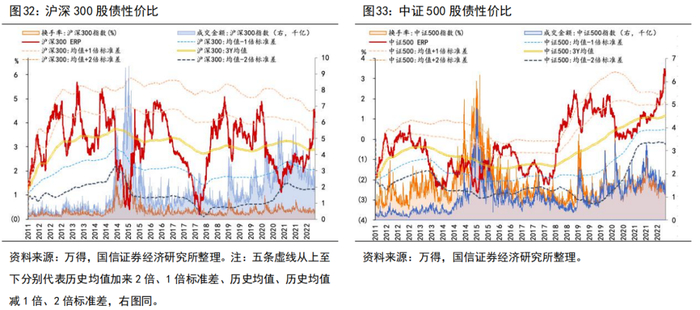 鉴于近年来股市的波动幅度较前几年相对减缓,我们采用动态跟踪的思路,以五年为一个窗口期,观测股债性价比处在过去五年间的分位点。我们以股票风险溢价(ERP)来度量股债相对比价,计算方法为股票市盈率倒数与利率债收益率之差(口径I),或者(股票市盈率+股息率)/利率债收益率(口径II)。ERP可以作为衡量股票相对于债券配置价值的参考指标。5月份,中国股债性价比在口径I、口径II下均上行至98.33%的历史分位数水平;美国股债性价比口径I上行至53.33%,口径II下行至20.00%,静态来看,中国股债性价比处于历史高位,未来投资于中国股票获得的潜在收益超出国债,目前中国股债性价比略优于美国。沪深300股债性价比与中证500股债性价比已经超过过去三年均值加两倍标准差,表明当前股票估值偏低,但小幅反弹行情向完全向好行情需等待利润底部出现,目前仍持观望态度。海外跨资产间比价:(1)5月美国股票和商品比价持续下行,接近历史均值减一倍标准差的水平。(2)美股和欧股间比值较上月底无显著变化。