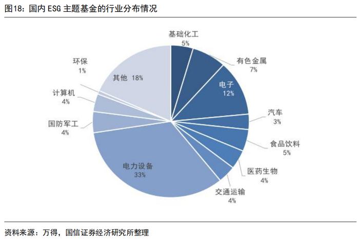 最后,我们从国内主要ESG主题基金的行业分布情况来剖析。截至2022年5月下旬,据万得统计,ESG主题基金共计168支(其中A、C份额按同一只基金统计),根据公募基金2021年年报披露的分行业投资市值(以申万行业分级为例),可以发现国内ESG基金主要的投资行业为电力设备(占比为33%)、电子(占比12%)、有色金属(占比为7%)、食品饮料(占比为5%)、基础化工(占比为5%)、计算机(占比为4%)、国防军工(占比为4%)、医药生物(占比为4%)、交通运输(占比为4%)、汽车(占比为3%),环保行业占比仅为1%,其他行业合计占比约为18%。可以发现,电力设备行业在ESG主题基金中占比具有较高的权重。从ESG相关行业的技术成熟度曲线来看,ESG发展处在较为成熟阶段的行业更容易成为ESG主题基金的持仓。