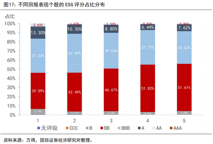 从触底反弹的角度,ESG的借鉴意义更强些。我们观测今年4月底以来个股的回报率分布,发现回报率排名在前20%的个股ESG评级相对较高。观察各组内个股的ESG评级分布可以发现,AAA级个股均在表现最好的一组内,而CCC级个股在回报表现最差的一层中,反弹越高的板块并非BBB及以上评分占比越高,甚至还是逆序的,从超跌反弹属性,评级极端的两类品种(AAA和CCC)的强反弹性和风险属性体现较为充分。