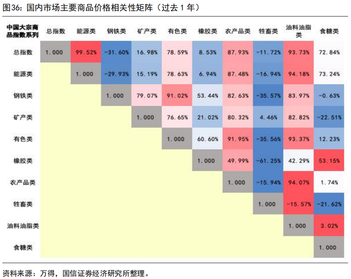 工业品和农产品价格关联:与上月相比,5月生产类商品(能源、钢铁、矿产、有色等)内部相关性方面,能源与钢铁相关性由正转负,能源与有色相关性由负转正,生活领域中,农产品类、油料油脂类、牲畜类、食糖类价格与其他生产类商品价格相关性较上月普遍持平或减弱。