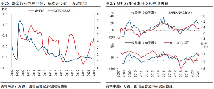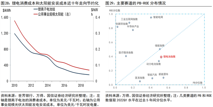 因此,抛开价格因素,煤炭和锂的分析还要回归到行业本身,同样用资本周期框架进行拆分:煤炭板块投资上一轮的高峰是在2012-2013年,近一年煤炭开采和洗选行业的固定资产投资完成额虽然走高了不少,但并没有超越过去三、四年的区间范围。资本周期的角度,新冠疫情后煤炭行业的盈利能力出现了快速抬升,而资本开支却一直处在较低的位置,且在“双碳”目标的约束下也很难看到煤炭企业提高Capex的意愿和前景,企业处在“盈利能力强、现金流稳定、进一步投产意愿弱”的组合下。按照世界银行的测算,无论是锂离子电池组的消费成本,还是光伏太阳能的安装成本,过去十年间都出现了明显的下降。锂电板块资本开支近年来扩张,盈利开始收缩,对板块收益率的边际增长构成一定限制。综上,传统能源和成长类金属的定位不同,也是导致开年煤炭和锂股价与商品价格背离所在。