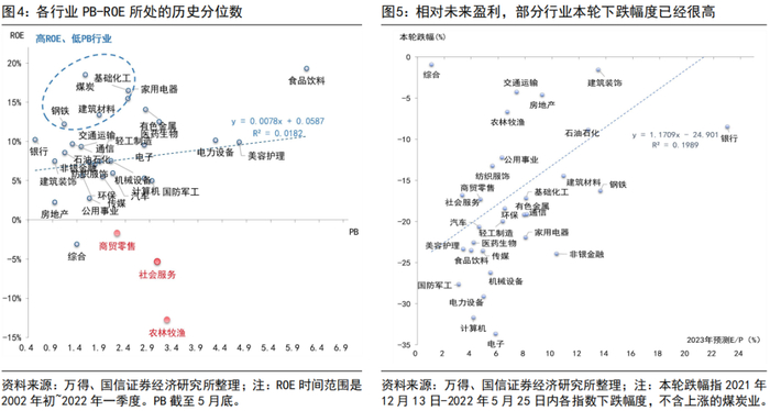 首先,PB-ROE体系下的行业存在两端分化:估值相对于盈利有溢价的上游板块(煤炭等),以及疫情扰动下困境反转的板块(商贸零售、社会服务和农林牧渔)。通过申万一级行业的PB-ROE横向分布来看,可以发现社会服务、商贸零售两个板块位列ROE最低的几个行业中,PB居于行业间中等位置。然而,以一季报的截面进行行业间横向比较也存在问题,即便医药、电子、通信等高估值的成长板块经历了一轮下跌,上游以煤炭为代表的周期板块经过这次上涨,估值较其他行业比仍然偏低。用“低PB、高ROE”的价值组合去筛选优质个股,采用均值回归的假设更适合放在纵向维度:我们计算了目前各申万一级行业的PB乘数、ROE水平所处在2002年以来的历史分位数,商贸零售、社会服务的ROE(4Q,TTM)跌到了近20年的最低水平,属于典型的困境反转型行业。而周期类行业(煤炭、有色、钢铁、基础化工、建筑材料)仍是典型的高ROE、低PB行业。