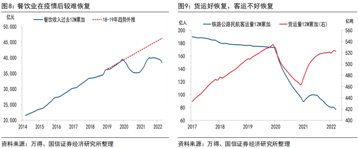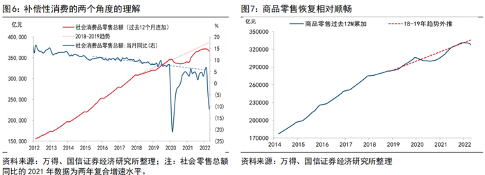 (2)分项来看,社会零售总额中的商品零售在疫情后的恢复路径较为容易,而餐饮业疫情后较难恢复。商品零售如果按照2018-2019年的历史路径来外推,则2021年7月起恢复到了正常路径上,2022年3月再度跌破趋势路径;如果直接比照疫情前位置(2019年12月),则早在2021年3月就已恢复如初;餐饮业则从未恢复至疫情前2018-2019年的趋势线上,虽然2021年6月-12月一度达到疫情前位置,但2022年起再度转弱。