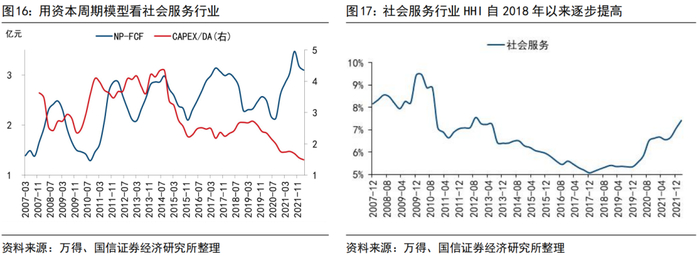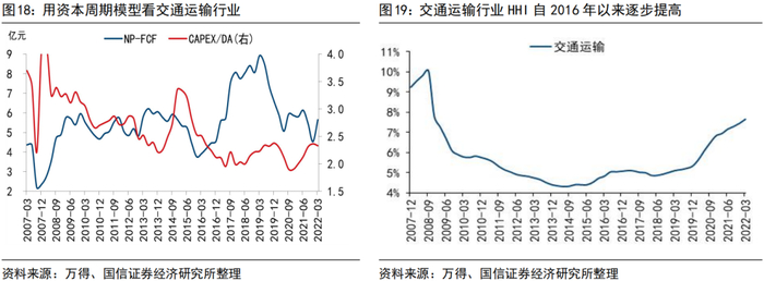 按照资本周期的体系来分析:A股中非金融板块的产业集中度(以HHI指数代理)在近10年来都是持续下降的,大多数行业的产业集中度都是在降低的,朝向更加市场化、竞争化的格局去演绎。只有少数的几个行业,如地产、有色、交运、社服、综合等板块集中度是在走高的。按照企业生命周期的角度来理解,国内大多数行业还是朝向更加竞争化的路径中,我们看到A股(拿掉金融和两桶油后)产业集中度是在持续下滑的,而反观上述行业则较早经历了竞争、洗牌、出清,形成龙头公司利好的发展格局,赚钱效应体现在出清后悲观预期的修复上,即市场整体对行业盈利能力前景悲观,但真实的ROE可能还要好于市场预期。因此,表观来看社会服务行业表现低迷是疫情影响、线下社交面临“物理封锁”,实际上资本开支经过疫情以来持续回落、净利润较疫情初期还处在较为适宜的位置时,虽然短期内利润承压较大,但也是容易产生预期偏差所在。作为对比,交通运输行业同样经历了一轮出清,最新一期数据显示资本开支除以折旧摊销比值下滑、净利润与现金流的轧差略有修复,但还是处在新冠疫情以来利润区间的低位、资本开支的高点。同样是走出疫情阴霾后,“市场出清+困境反转”的逻辑下,社会服务板块的表现可能更值得期待。