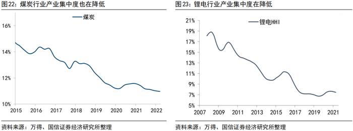 有很多模糊的逻辑可以解释去年煤炭和锂两大板块股价的上涨:新旧能源的转化推升成长性金属,长期目标短期聚焦、供给因素导致“旧经济”底色的传统能源价格扭曲……。如果从两大行业相关的财务方面的指标分析,产业集中度上无论是煤炭还是锂电都是在朝着多元化、竞争化迈进的,体现为HHI的趋势性走低上,且锂电板块的集中度(7-9%)比煤炭行业(10-12%)还要更低一些。