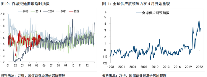另一个受到新冠疫情冲击较高的行业即交通运输业。按照2020年疫情后修复的经验:(1)货运好恢复、客运不好恢复,因此“报复性旅行出游”也较难出现。我们看到铁路、公路、民航客运量在新冠疫情以来持续低迷,反而货运量恢复较为充分。全球供应和物流的视角下,美联储发布的供应链压力指数自去年底就在下降路径中,4月全球供应瓶颈问题短期卷土重来和疫情的二次袭扰有关。(2)我们用百城交通拥堵延时指数来反映城市交通的“内部流通”,这轮上海和吉林疫情期间,全国主要城市并未出现类似武汉疫情期间交通大幅受限的局面,鉴于该数据表示城市居民平均一次出行实际旅行时间与自由流状态下旅行时间的比值,可以发现虽然省际间“外部流通”在这轮冲击中被阻断,甚至对全国大多数地区都有溢出效应,但各城市内部出行并未受到打压。因此,疫情影响地区与非影响地区间的开放、省际间的道路货运开放依然是疫情后交通恢复的主要路径,而客运及相应的差旅,在今年的时间范畴内并不是那么容易恢复如初的。