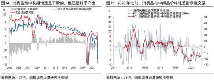 2019、2020年宏观数据中消费的增速是一路下滑的,但这两年都是消费大年,是否说明自上而下宏观视角对消费板块的指引失效了?(1)首先通过供需分析,虽然社零增速在次贷危机后就是在下滑的,但是还是要超过工业产出的增速的,直到近2年疫情反复对大消费板块构成牵制以前,都是供不应求的逻辑;(2)其次,透过下游消费利润的角度,历次消费风格占优的时候都是消费品价格与中间品价格轧差提升的时期。而2021年开始,我们发现阶段性走出疫情阴霾时,受制于收入与就业预期的不甚明朗,恢复过程中消费的增速是持续低于工业产出增速的,导致了消费板块的低迷。