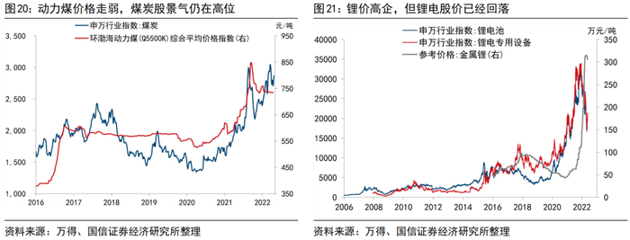 在2021年开启的新一轮商品周期中,能源和金属类的周期股价格,与相应的商品价格均出现了大幅的上涨,而今年煤和锂股价和对应商品价格走势开始脱钩。(1)自去年四季度起,“碳冲锋”开始回归“碳中和”的平稳轨道,监管着力完善煤炭市场价格形成机制,煤炭价格高位回落,但直到今年初,煤炭股都在一路高歌猛进。(2)全球主要经济体在这一轮恢复中,或多或少都面临供应瓶颈的约束,需求端海外新能源汽车积压订释放、锂电中下游产业链大幅扩产、电池级碳酸锂供不应求。供给端锂矿开采和精炼两个环节的速度存在限制,锂矿供给集中在澳大利亚、智利和阿根廷等地,未来几年开发进度看不到边际加速,因而处在供不应求的阶段。结构上看,新一轮全球复苏中产业升级的抓手又集中在“绿色化”、“ESG”的维度。多重因素使得锂价居高不下,但是锂电相关板块却录得大幅回撤。