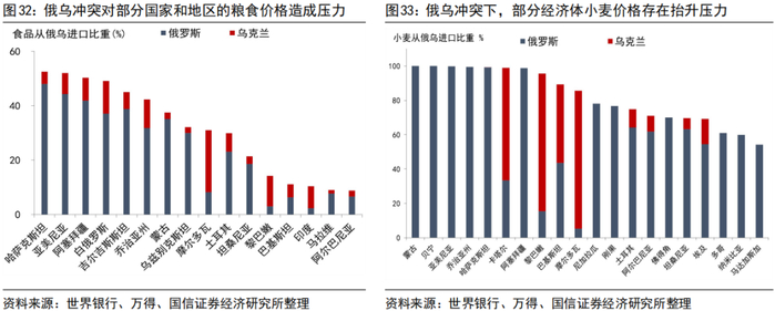 从国际粮价和粮食安全问题产生的背景来看:(1)俄乌冲突是重要的导火索,俄罗斯与乌克兰的小麦出口占到全球三成左右,卡塔尔、黎巴嫩、摩尔多瓦,以及土耳其、埃及、坦桑尼亚、阿尔巴尼亚等经济体对乌克兰小麦进口需求占比高,蒙古等国的小麦进口几乎全部来自俄罗斯,因此从全球“粮仓起火”,给俄乌食品进口依赖度较高的国家和地区造成了输入性的通胀压力。(2)极端气候导致干旱天气在粮食产地蔓延,在台风和“厄尔尼诺”现象的接力下,南非、巴西、阿根廷等面临干旱,而巴西和阿根廷是全球玉米和大豆的主要产地,其出口量、价格也会受到相应影响。(3)俄罗斯和白俄罗斯也是重要的化肥出产地,俄乌冲突导致化肥的产量和贸易受限,国内化肥负担率提升。
