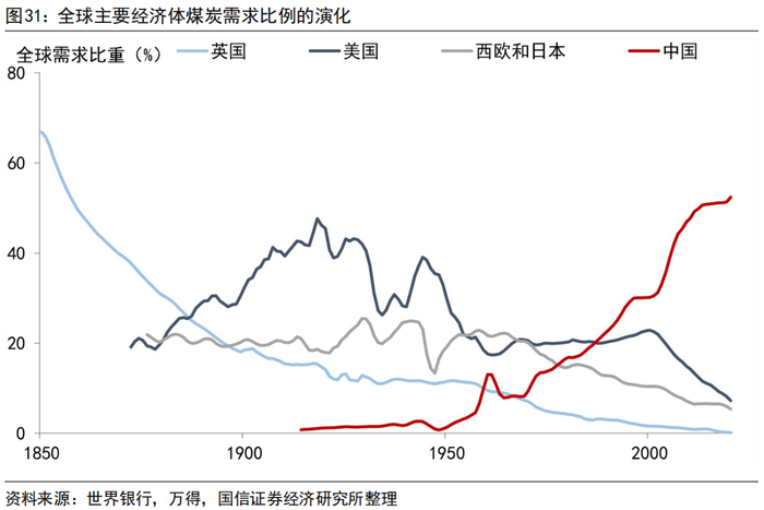 以相对长期视角来看煤炭消费的变迁:按照美、日、德、英的经验,随着人均收入提高,煤炭消费出现前期快速提升和后续缓慢回落。中国过去70年间煤炭的需求量伴随人均收入双双走高,和美国、英国、德国煤炭消费的早期发展路径没有差别,上述发达经济体经历了煤炭到原油、天然气、页岩气的长期过渡过程,而新的能源革命到来时,各国是站在同一起跑线上的。从这个角度上讲,我国能源变革的历史包袱相对更小,新能源领域有望实现弯道超车,中长期对这一产业进步与产业升级的方向还是存在利好、需要着重布局的。