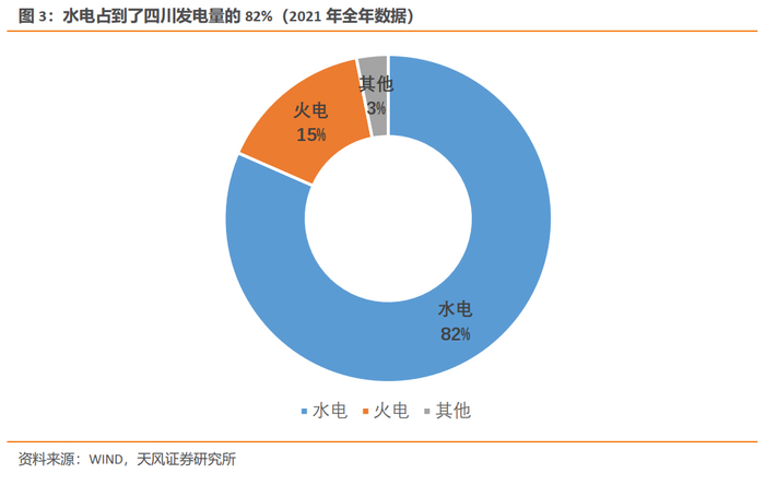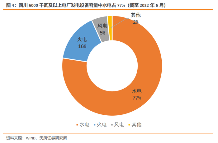四川的发电结构严重依赖水电,干旱对电力供应的冲击明显。四川2021年全年发电量4330亿千瓦时,其中水电3531亿千瓦时,占比达高达82%,而同期全国发电量中水电占比仅有15%。从发电装机容量来看,截至今年6月,水电占四川6000千瓦及以上电厂发电设备容量的77%,而火电仅有16%,意味着即使是在满发的情况下,火电也很难对冲水电的缺口。