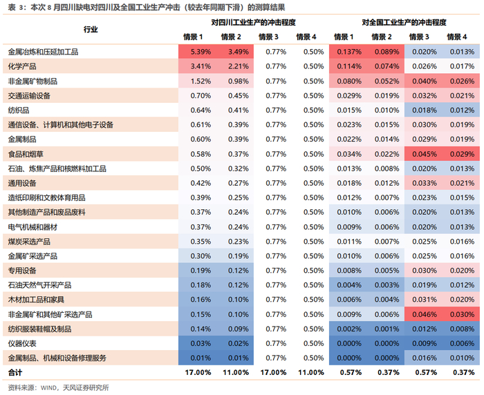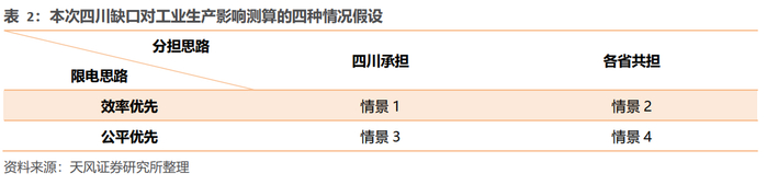 维度二,是否与外送省份共担电量缺口。在四川独自承担缺口的情况下,电量缺口占四川去年同期用电量的17%;在与外送省份共担缺口的情况下,电量缺口占四川去年同期用电量的11%。共担以后,接受外送省份的工业生产预计会受到间接影响,但考虑多省分担后对单一省份的影响相对可控,因此我们仅考虑对四川工业生产的冲击。