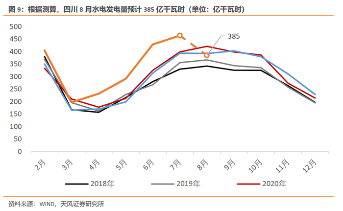 火电预计至少能填补24亿千瓦时缺口。7月,四川水力发电颓势已经初步体现,已经通过加大火力发电规模来进行对冲,四川7月火电发电较去年同期多出24亿千瓦时。保守估计下,8月火电能够提供的额外发电量至少应与7月持平。