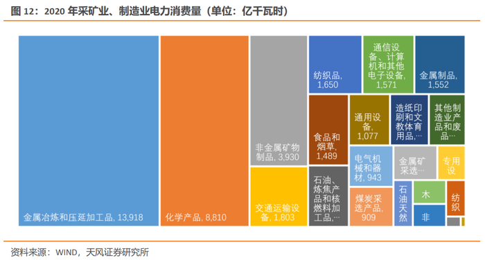 第一,哪些工业生产电力消耗较大?考虑到电、热、燃、水的生产和供应业具有民生属性,我们仅考察采矿业和制造业。分析2020年全国各行业电力消费数据,金属冶炼和压延加工、化学产品制造、非金属矿物制造、交通运输设备制造分别消费电力13918、8810、3930、1803亿千瓦时,占采矿业+制造业电力总消费量的32%、20%、9%、4%,占比合计达到65%。