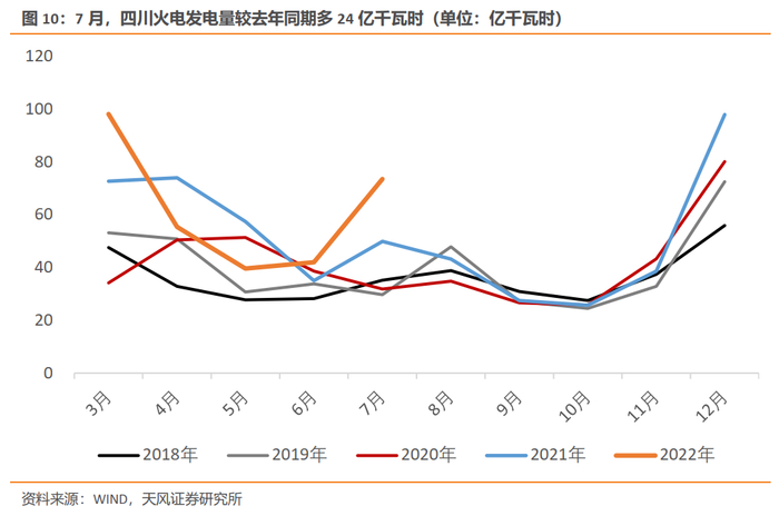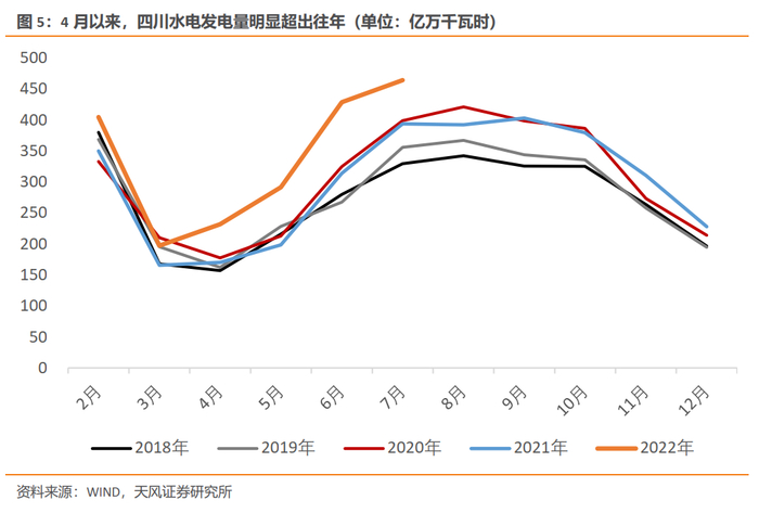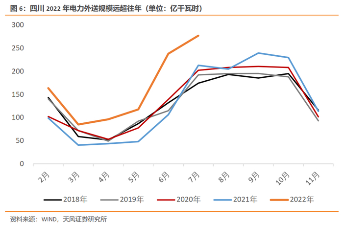 相比往年,四川今年水电发电量已经处于较高水平。今年1-7月,四川水电产量合计2018亿千瓦时,同比去年增长22%,明显高出往年同期水平。我们认为,这可能与能源保供背景下四川外送电力额度增加有直接的关系。今年1-7月,四川共向外省输出电量977亿千瓦时,同比去年增加47%。