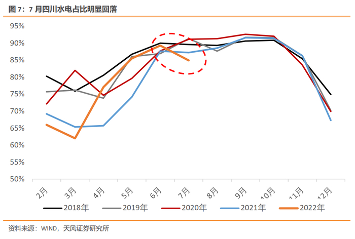 四川7月发电已经受到了干旱气候的冲击。正常情况下,三季度是四川水力发电的旺季。2018-2021年,四川7-9月水电发电量占比分别为90%、89%、92%,明显高于上半年。而今年7月,在水电发电量仍在走高的情况下,四川水电占比明显回落,仅有85%,较季节性水平低5个百分点。这意味着7月开始,四川已经在使用其他发电方式来对水电进行补充,说明在当前情况下,四川对水力的利用程度已经基本打满。