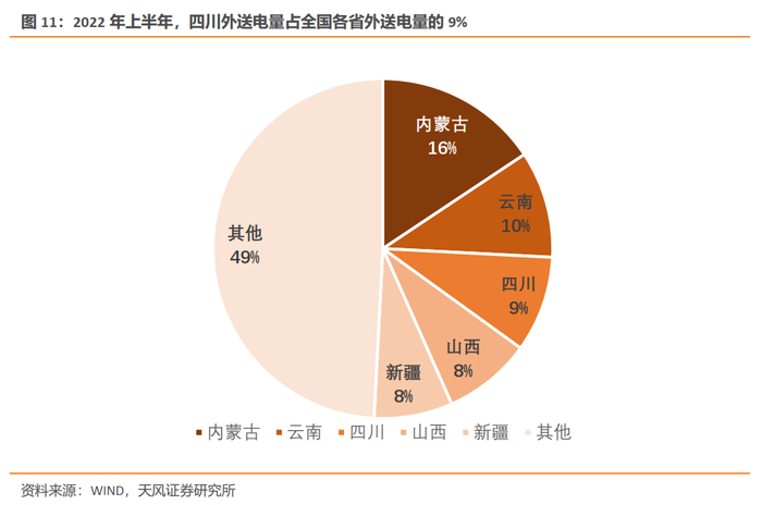 不过,由于四川还是电力外送的大省,2022年上半年,四川外送电量占到了全国外送电量的9%,仅次于内蒙古和云南。如果四川缺电进一步加剧,需要协商调减外送电量,则部分原本接受西电东输的东部省份可能会受到间接的影响。