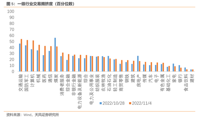 11月第1周,30个一级行业的平均拥挤度回升至25%分位,拥挤度最高的交通运输上升至54%分位,计算机和医药行业拥挤度较上周涨超10%,银行、食品饮料、建材的拥挤度最低。资金流向转守为攻,30个一级行业中仅通信、建筑和银行是净卖出,电新、有色、食品饮料、汽车和医药等新旧核心资产的净买入较多。