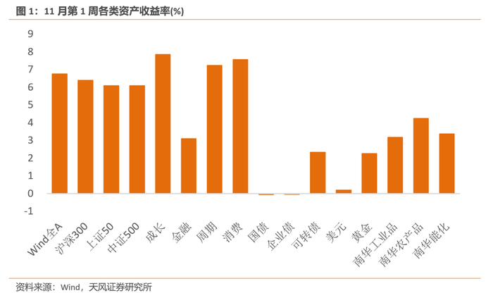 11月第1周,A股的风险溢价整体维持在【极便宜】区间内,其中Wind全A、上证50、沪深300的风险溢价分位数为89%、96%和97%分位,中证500小幅下降至63%分位。金融、周期、成长、消费的风险溢价分位数为97%、96%、95%、84%分位。大盘股的风险溢价水平再次创下年内新高。当前Wind全A的风险溢价处在中位数以上1.2个标准差水平,中期(三个月)性价比具有吸引力(接近2014年年中、2018年年底、2020年4月水平)。