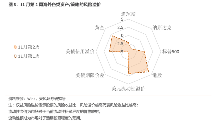 11月FOMC如期加息75bp,会后鲍威尔暗示最快12月开始放慢加息的步伐,但是加息可能更久更高,终点利率可能高于9月美联储点阵图预期的4.6%。鲍威尔释放偏鹰信号后,在岸美元流动性溢价小幅回升至44%分位,继续向中性水平靠近,离岸美元流动性溢价依然维持历史高位(94%分位)。美国和非美经济体的金融条件差异连续第5周收敛,美元指数由强转弱。