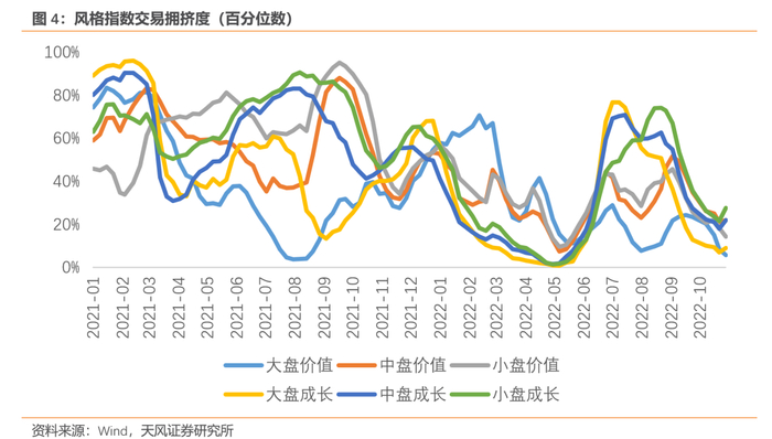 11月第1周,价值股的拥挤度继续降低,成长股的拥挤度开始从绝对低位回升。大盘价值、大盘成长、中盘价值、中盘成长、小盘价值、小盘成长的拥挤度分别为6%、9%、22%、22%、14%、28%历史分位。当前市场的交易情绪与4月中旬的水平持平,需要关注成长交易拥挤度反弹的持续性。从历史规律来看,交易拥挤度低位反转将是情绪反转的同步指标,并且起点越低,短期盈亏比越高。