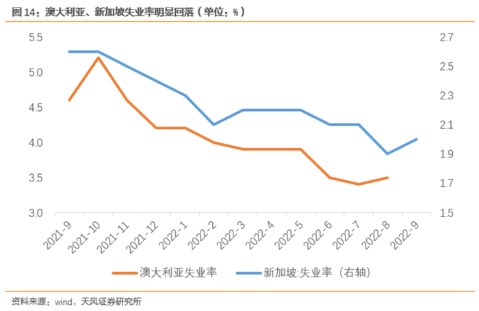 与经济修复相匹配的是失业率的变化,新加坡、澳大利亚这一时期的失业率明显回落,如澳大利亚的失业率从2021年11月的4.6%振荡回落至2022年8月的3.5%。中国香港的表现则相对弱一些,受疫情影响,中国香港失业率从2021年11月的4.2%上行至2022年4月的5.4%,之后有所回落,2022年9月为3.9%,仅略低于疫情前。