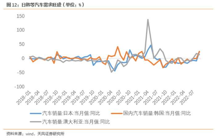 第四,在疫情开始蔓延后,医药类和汽车类等可选消费的表现旺盛,比如韩国2022年9月汽车销量同比上行23.8%,医药品同比上行14.2%。前者可能是在疫情蔓延时,居民会购置部分常用药备用,后者除了与疫情冲击下居民私人出行需求上升有关外,也可能与此前全球汽车产业链供应链不畅,汽车需求在供应链修复后集中释放有关。