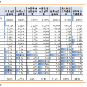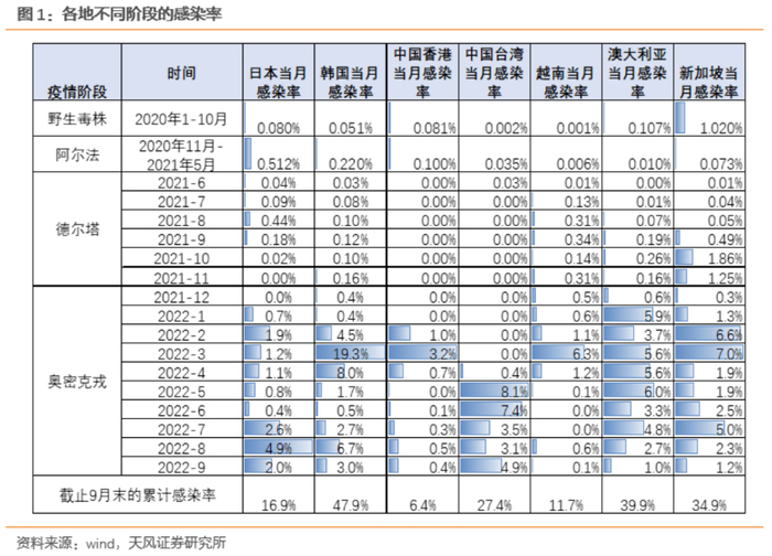 第二,从样本地区疫情发展上看,奥密克戎的第一轮周期大致持续1-2个季度,上升期持续1-2个月,如韩国确诊人数从2022年2月开始快速上行,在3月达到高点;新加坡确诊人数从2022年1月开始上行,在3月达到高点。下降期持续2个月左右,澳大利亚和中国台湾的下降期持续时间超过了3个月。