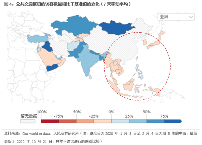 从零售和娱乐场所的访客数量指数上看,在奥密克戎感染人数上升期,除越南上行、新加坡接近持平外其他国家和地区的零售和娱乐场所访客数量指数均有所回落。感染率下降后,样本国家和地区到访零售和娱乐场所的访客数量有所回升,其中越南和新加坡明显超过2021年11月的水平。