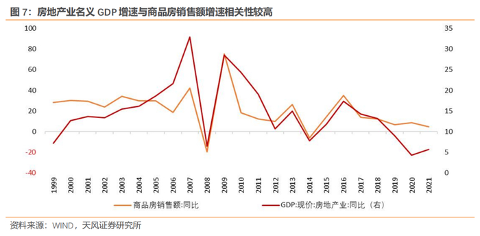 从数据上来看,房地产业名义GDP增速与商品房销售额增速之间确实存在相对较高的正相关性,但不同阶段的相关程度并不一致。2000-2007年二者的相关系数为0.46,2008-2017年进一步提升至0.84,但2018年以来相关性有所下降,2018-2021年相关系数仅为0.66。