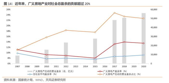 综合投资活动和服务活动,广义房地产业对社会总盈余的贡献在近年来超过20%。2020年,广义房地产业共拉动各行业盈余5.6万亿元,占比达22.7%,盈余率为13.5%,盈余率高出社会平均水平4.4个百分点,但盈余率及盈余占比在2018年以来均出现边际回落。