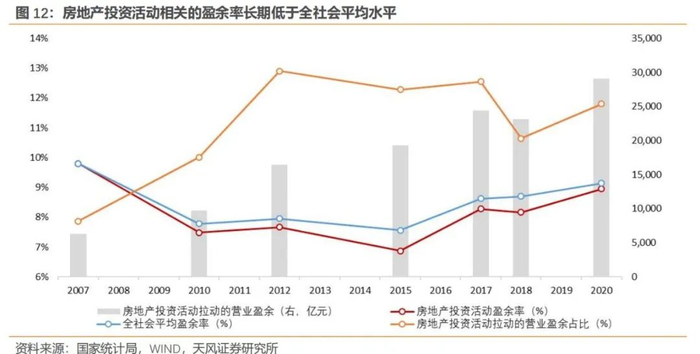 从盈余率角度看,尽管房地产投资活动影响的产业规模较大,但利润率并不算高。2010年以来,房地产投资活动的盈余率始终保持在小幅低于全社会平均盈余率的水平,可能是因为与房地产投资关联较高的建筑、建材业的利润率偏低。