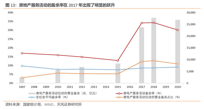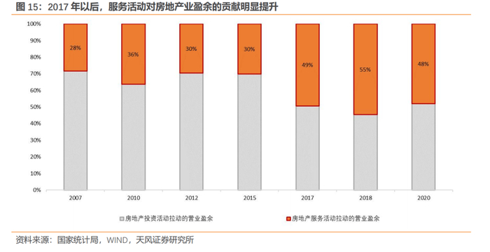 从广义房地产业内部的盈利贡献来看,2017年同样是个分水岭。2017年以前,投资活动是贡献盈利的主要分项,占比在30%左右;而2017年以后,服务活动对盈利的贡献明显提高,目前二者基本接近。