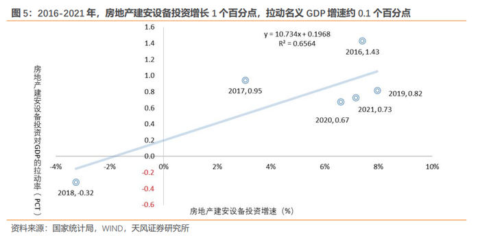 同时,从2016年以来的连续数据来看,房地产建安设备投资对名义GDP增速有稳定的拉动作用,房地产建安设备投资每增长1个百分点,可以拉动名义GDP增速提升约0.1个百分点。