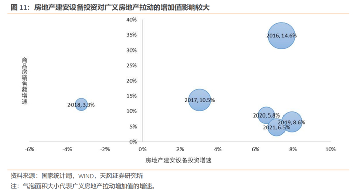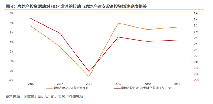 由于房地产投资活动带来的增加值更多,因此房地产建安设备投资对广义房地产拉动的增加值有更大的影响,对GDP的影响也相应更大。