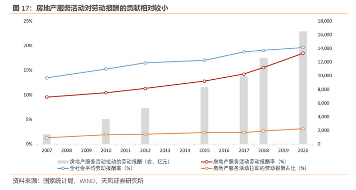 相比于投资活动,房地产服务活动对居民收入的贡献更少。2020年,房地产服务活动拉动各行业劳动报酬合计1.6万亿元,仅占全社会劳动总报酬的3.1%,与其对名义GDP7%左右的贡献率相比,明显偏低。