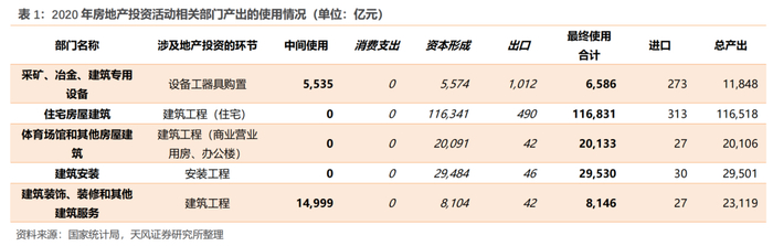 以2019年修订后的《2017年国民经济行业分类》以及最新的投入产出表(2020年)数据精度为准,房地产建安设备投资活动具体对应:住宅房屋建筑业,体育场馆和其他房屋建筑业,建筑安装业,建筑装饰、装修和其他建筑服务业,采矿、冶金、建筑专用设备制造业。其中,后三项中仅包括与住宅、商业营业用房、办公楼等商品房相关的活动。