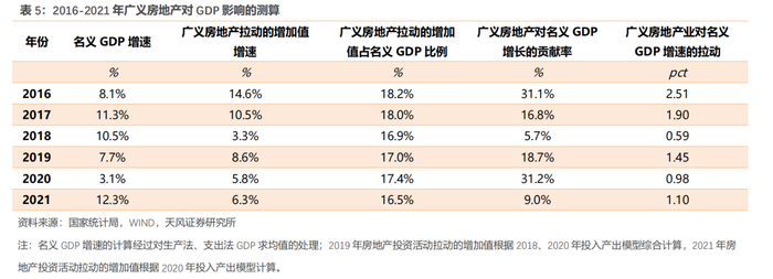 我们将房地产业增加值代入到前文构建的投入产出开放模型以后,得到的测算结果与上述方法一致。原因在于,房地产业直接、间接消耗的中间产品的增加值,通过生产过程转移到了房地产业上,因此利用“房地产业增加值/名义GDP”实际上已经全面衡量了房地产业对GDP的影响,包括房地产业自身及对其他行业的拉动。