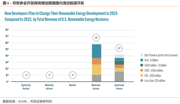 美国可再生能源委员会(ACORE)的调查报告《2023-2026年可再生能源融资预期》显示,58%的能源开发商将在2023年适度增加可再生能源开发,其余42%将大幅增加可再生能源开发。