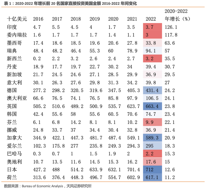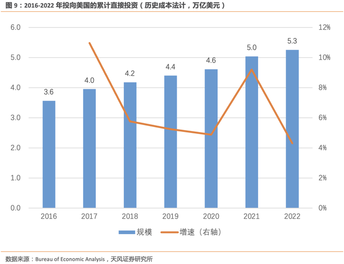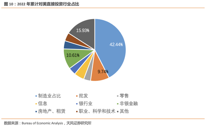 2022年外商对美直接投资(FDI)的累计金额达到了5.3万亿美元,增速4.3%,制造业FDI的占比达到了42%,增速5%。从国家来看,日本、英国、荷兰是对美直接投资累计金额前三的国家。