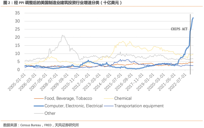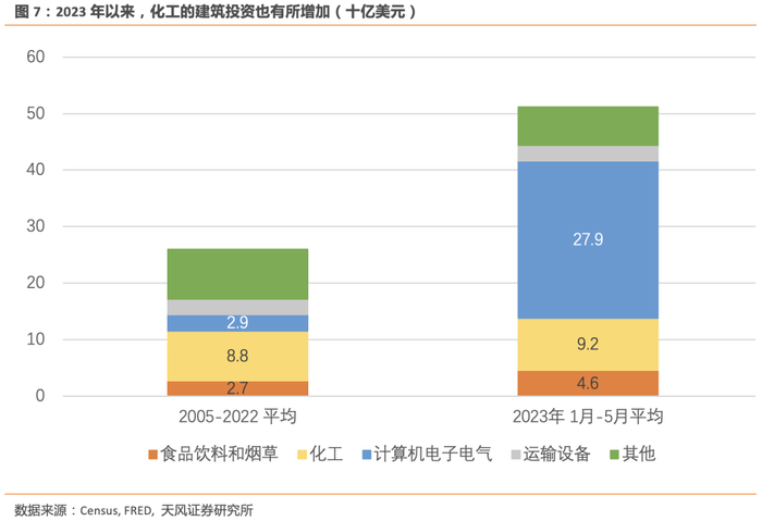 拆分美国制造业建筑投资增速(主要是厂房和工业基础设施)的具体行业贡献,有两个行业表现突出,一个是计算机、电子和电力设备,另一个是化工。
