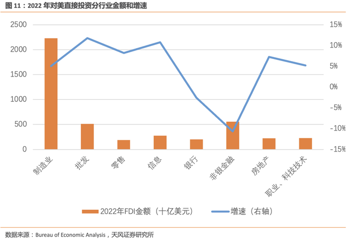 因此本轮美国制造业投资增速大幅上升的资金来源,除了有两个法案带来的补贴以外,还有外商对美直接投资上升。