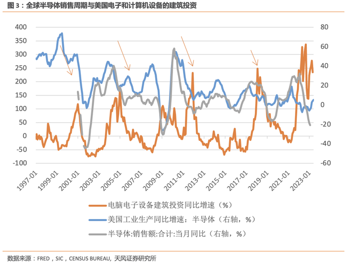 从历史经验看,美国计算机电子设备制造业的建筑投资滞后于全球半导体周期,且建筑投资的上行周期一般在一年以内。但是这一次两者出现分叉,全球半导体销售增速从2022年2月开始回落,而美国计算机电子设备制造业的建筑投资增速在2022年9月见顶后依然维持了200%以上的增速,且这一轮的上行周期超过了两年。