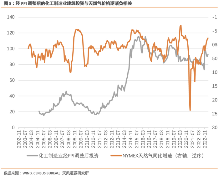 除计算机电子电力设备以外,另一个资本开支增量显著的行业是化工。美国化工业的投资上升与天然气有直接关系,因为在化工业中,天然气被用于化工生产原料和发电,因此拥有大规模天然气供应对化工行业的全球竞争力至关重要。